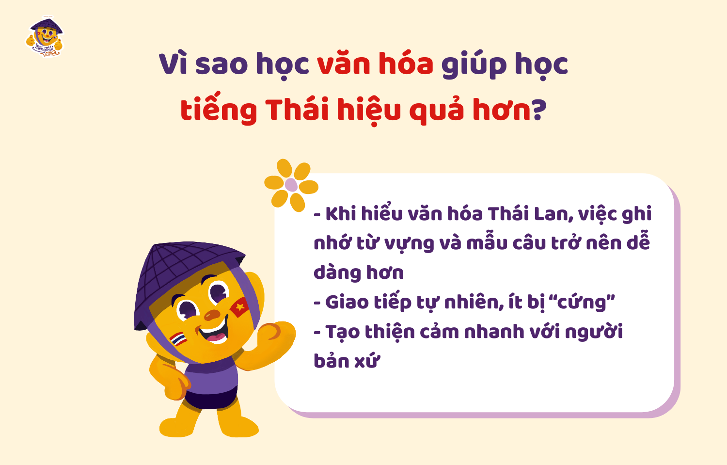 - Khi hiểu văn hóa Thái Lan, việc ghi nhớ từ vựng và mẫu câu trở nên dễ dàng hơn